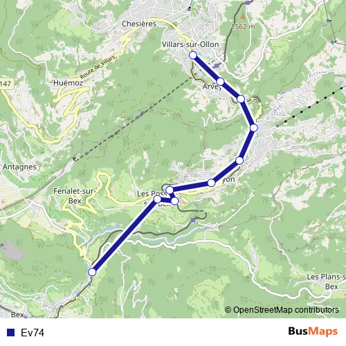 The first stop of the Ev74 bus route is Bévieux, gare and the last stop is Villars-sur-Ollon, gare. Ev74 is operational during täglich.