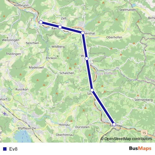 The first stop of the Ev8 bus route is Rikon im Tösstal, Bahnhof and the last stop is