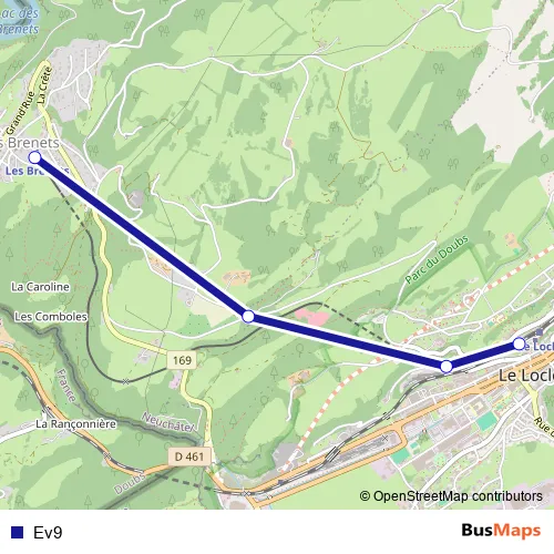 The first stop of the Ev9 bus route is Les Brenets, gare and the last stop is Le Locle, gare. Ev9 is operational during täglich.