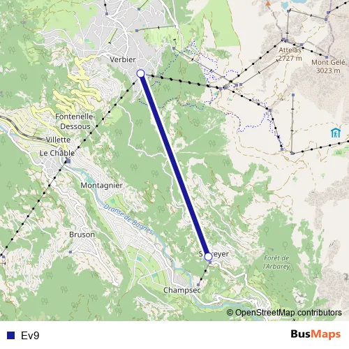 The first stop of the Ev9 bus route is Verbier, Médran and the last stop is Sarreyer. Ev9 is operational during täglich.