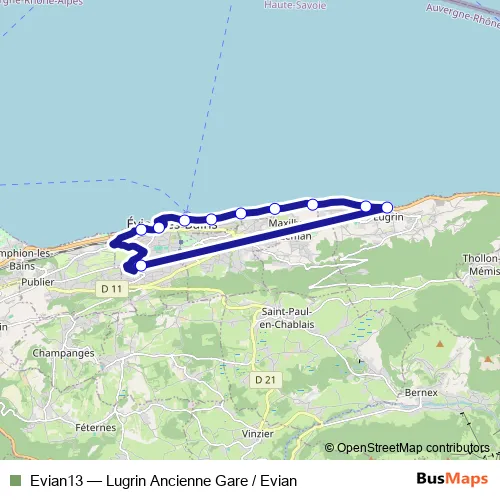 The first stop of the Evian13 bus route is Ancienne Gare and the last stop is Collège Les Rives du Léman. Evian13 (Lugrin Ancienne Gare / Evian) is operational during an Werktagen.