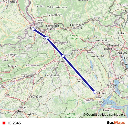 The first stop of the IC 2345 rail route is Basel Sbb and the last stop is Rothenburg Station. IC 2345 is operational during täglich.