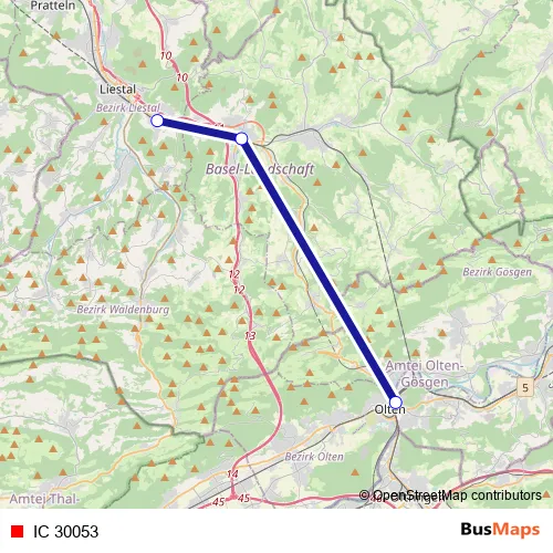 The first stop of the IC 30053 rail route is Lausen and the last stop is Olten. IC 30053 is operational during am Wochenende.