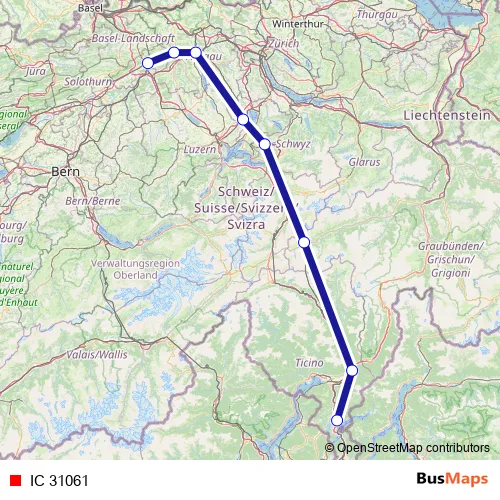 The first stop of the IC 31061 rail route is Olten and the last stop is Lugano. IC 31061 is operational during täglich.