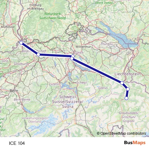 The first stop of the ICE 104 rail route is Basel Sbb and the last stop is Chur. ICE 104 is operational during am Wochenende.