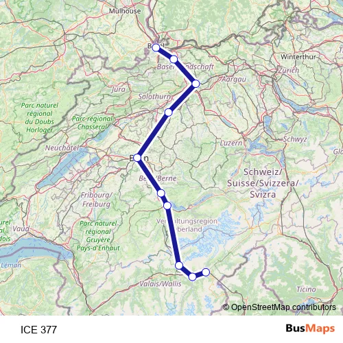 The first stop of the ICE 377 rail route is Basel Sbb and the last stop is Brig. ICE 377 is operational during am Wochenende.