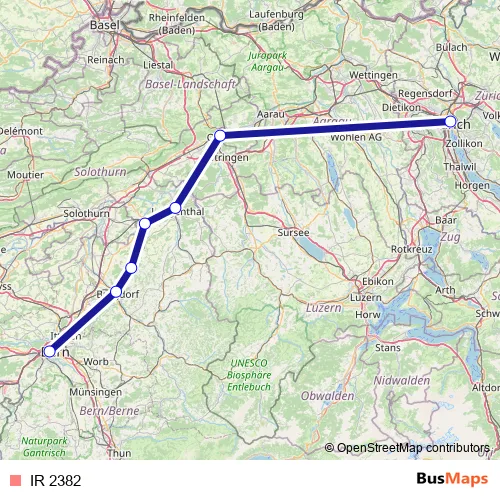 The first stop of the IR 2382 rail route is Zürich Hb and the last stop is Bern. IR 2382 is operational during täglich.