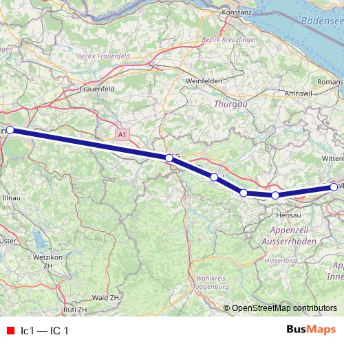 The first stop of the Ic1 rail route is St. Gallen and the last stop is Winterthur. Ic1 (IC 1) is operational during täglich.