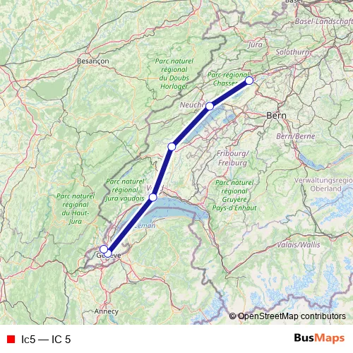 The first stop of the Ic5 rail route is Biel/Bienne and the last stop is