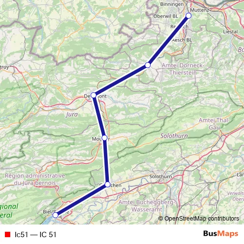 The first stop of the Ic51 rail route is Biel/Bienne and the last stop is Münchenstein. Ic51 (IC 51) is operational during am Wochenende.