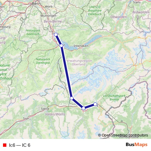 The first stop of the Ic6 rail route is Brig and the last stop is Thun. Ic6 (IC 6) is operational during täglich.