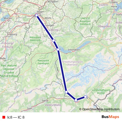 The first stop of the Ic8 rail route is Bern and the last stop is
