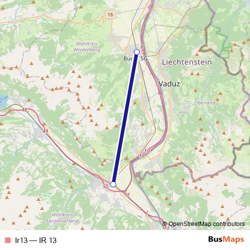 The first stop of the Ir13 rail route is Sargans and the last stop is Buchs Sg. Ir13 (IR 13) is operational during täglich.
