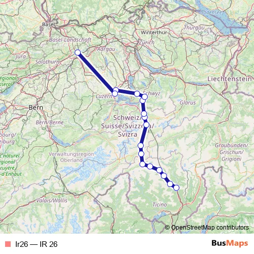 The first stop of the Ir26 rail route is Biasca and the last stop is Olten. Ir26 (IR 26) is operational during täglich.