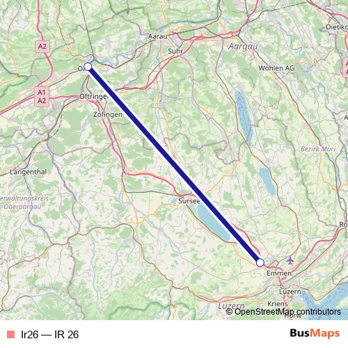 The first stop of the Ir26 rail route is Olten and the last stop is Rothenburg Station. Ir26 (IR 26) is operational during täglich.