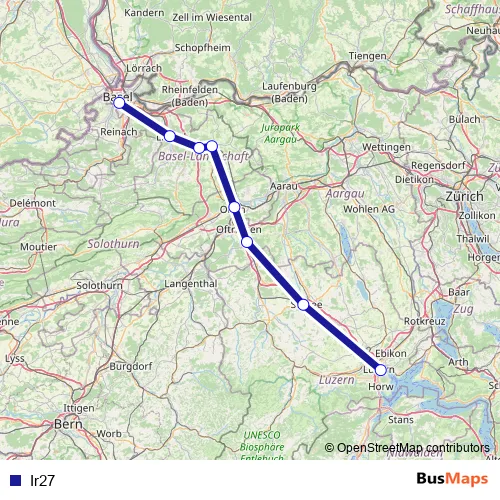 The first stop of the Ir27 rail route is Basel Sbb and the last stop is Luzern. Ir27 is operational during täglich.