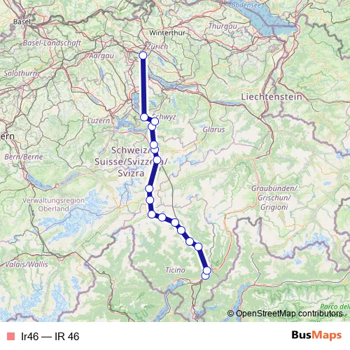 The first stop of the Ir46 rail route is Bellinzona and the last stop is Zürich Hb. Ir46 (IR 46) is operational during täglich.