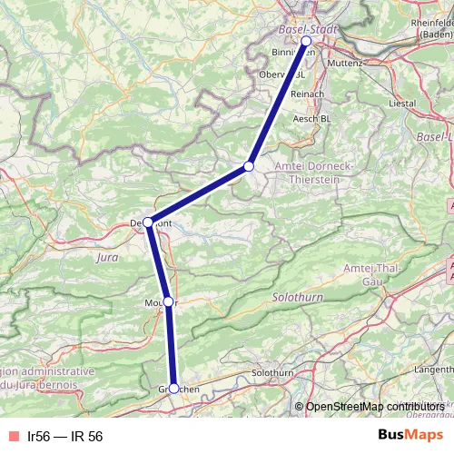 The first stop of the Ir56 rail route is Basel Sbb and the last stop is Grenchen Nord. Ir56 (IR 56) is operational during am Wochenende.