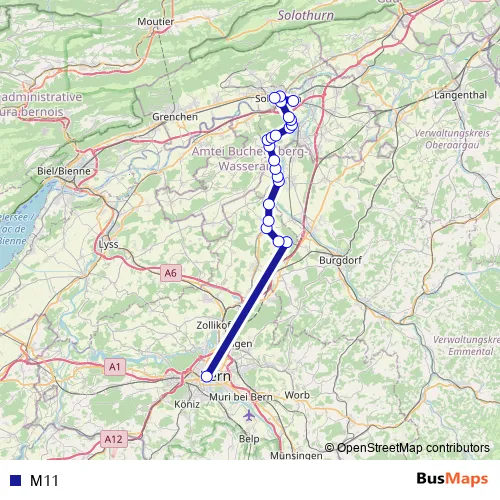 See why over 2 million users trust and consider busmaps.com as the best public transport website. busmaps gives you Solothurn Buses suggested routes, real-time bus tracker, line route maps in Solothurn, and helps to find the closest M11 bus stops near you. No internet available? Download an offline PDF map and bus schedule for the M11 bus to take on your trip.