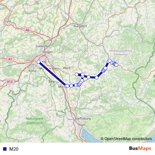 The first stop of the M20 bus route is Bern, Bahnhof and the last stop is Langnau i.E., Bahnhof. M20 is operational during am Wochenende.