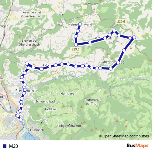 The first stop of the M23 bus route is Thun, Bahnhof and the last stop is Heimenschwand, Post. M23 is operational during am Wochenende.
