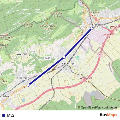 The first stop of the M52 bus route is Oensingen, Bahnhof and the last stop is Oberbipp, Eintracht. M52 is operational during am Wochenende.