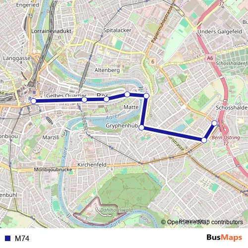 The first stop of the M74 bus route is Bern, Ostring and the last stop is Bern, Sonnenhof. M74 is operational during am Wochenende.