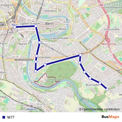 The first stop of the M77 bus route is Bern, Elfenau and the last stop is Bern, Bahnhof. M77 is operational during am Wochenende.