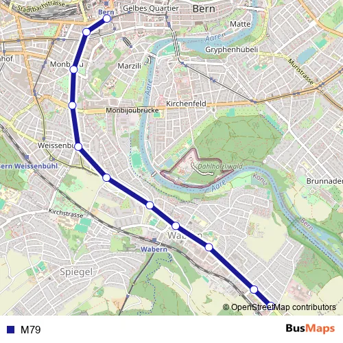 The first stop of the M79 bus route is Bern, Bahnhof and the last stop is Wabern, Kleinwabern. M79 is operational during am Wochenende.