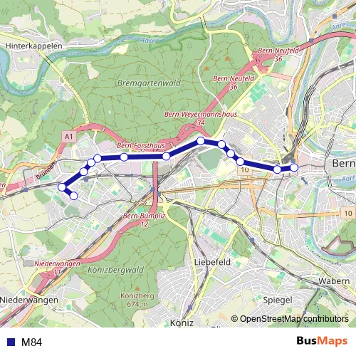 See why over 2 million users trust and consider busmaps.com as the best public transport website. busmaps gives you Bern Buses suggested routes, real-time bus tracker, line route maps in Bern, and helps to find the closest M84 bus stops near you. No internet available? Download an offline PDF map and bus schedule for the M84 bus to take on your trip.