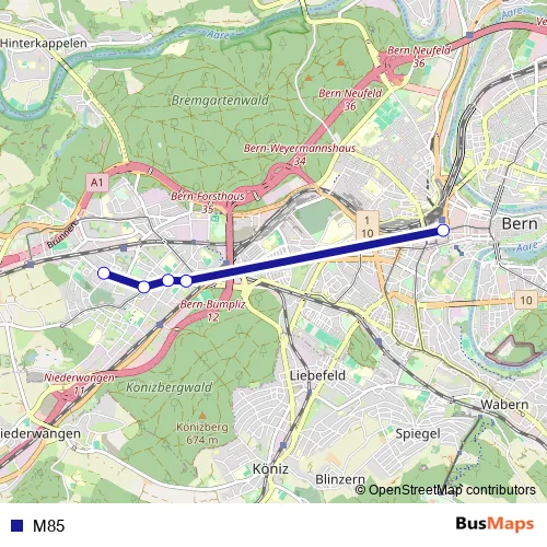 See why over 2 million users trust and consider busmaps.com as the best public transport website. busmaps gives you Bern Buses suggested routes, real-time bus tracker, line route maps in Bern, and helps to find the closest M85 bus stops near you. No internet available? Download an offline PDF map and bus schedule for the M85 bus to take on your trip.
