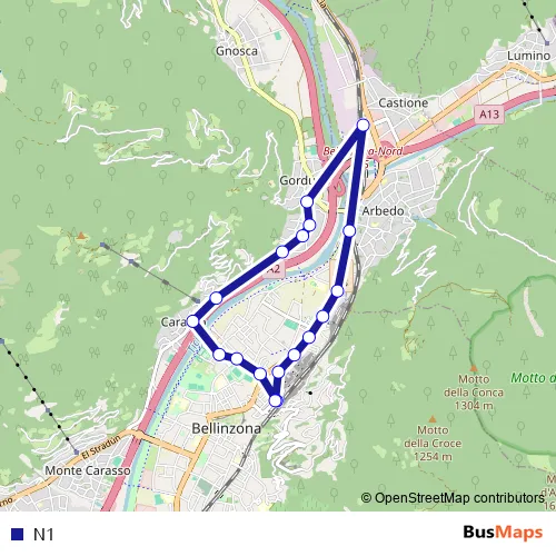 The first stop of the N1 bus route is Bellinzona, Stazione and the last stop is Bellinzona, Stazione. N1 is operational during täglich.