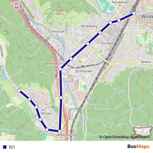 See why over 2 million users trust and consider busmaps.com as the best public transport website. busmaps gives you Winterthur Buses suggested routes, real-time bus tracker, line route maps in Winterthur, and helps to find the closest N1 bus stops near you. No internet available? Download an offline PDF map and bus schedule for the N1 bus to take on your trip.