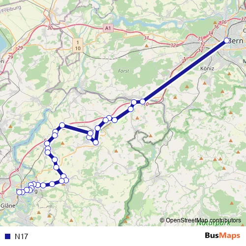 The first stop of the N17 bus route is Bern, Bahnhof and the last stop is Fribourg/Freiburg, gare rout.. N17 is operational during am Wochenende.