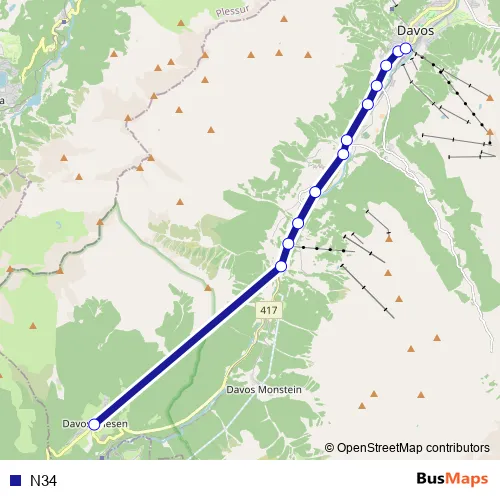 The first stop of the N34 bus route is Davos Wiesen, Kirche and the last stop is Davos Platz, Bahnhof. N34 is operational during täglich.
