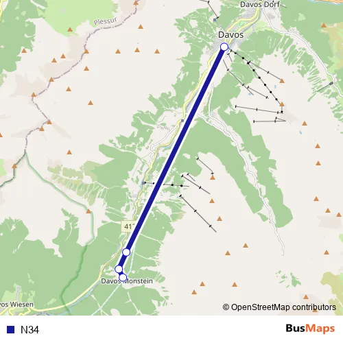 The first stop of the N34 bus route is Davos Monstein, Dorf and the last stop is Davos Platz, Bahnhof. N34 is operational during täglich.