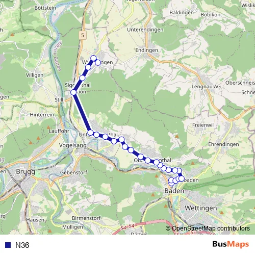 The first stop of the N36 bus route is Baden, Bahnhof West and the last stop is Würenlingen, Post. N36 is operational during am Wochenende.