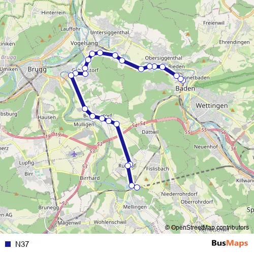 The first stop of the N37 bus route is Baden, Bahnhof West and the last stop is Dättwil AG, Segelhof. N37 is operational during am Wochenende.