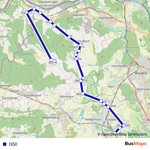 The first stop of the N50 bus route is Oberglatt ZH, Bahnhof and the last stop is Bachs, Neu-Bachs. N50 is operational during am Wochenende.