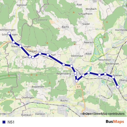 The first stop of the N51 bus route is Oberglatt ZH, Bahnhof and the last stop is Schneisingen, Mitteldorf. N51 is operational during am Wochenende.