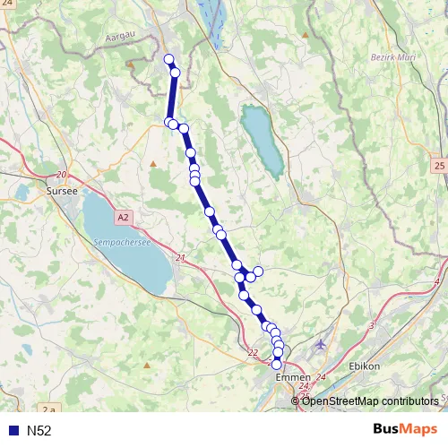 The first stop of the N52 bus route is Menziken, Bahnhof and the last stop is Emmenbrücke, Sprengi. N52 is operational during täglich.