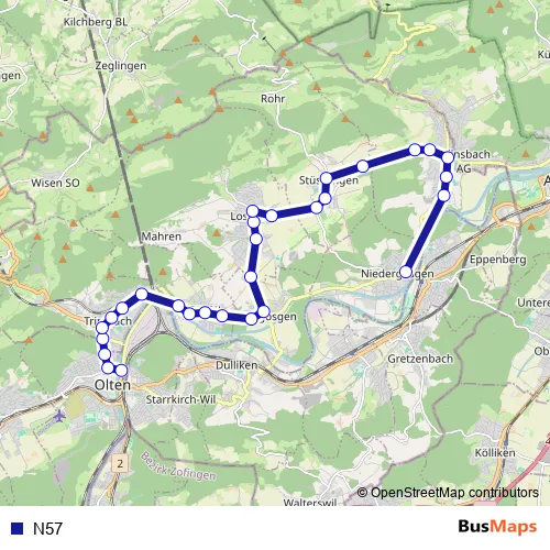 See why over 2 million users trust and consider busmaps.com as the best public transport website. busmaps gives you Olten Buses suggested routes, real-time bus tracker, line route maps in Olten, and helps to find the closest N57 bus stops near you. No internet available? Download an offline PDF map and bus schedule for the N57 bus to take on your trip.