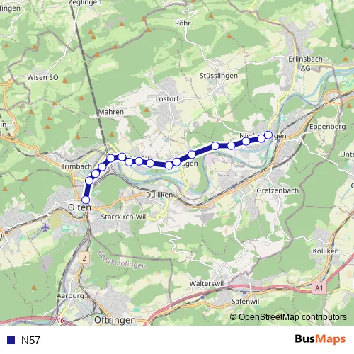 The first stop of the N57 bus route is Niedergösgen, Jurastrasse and the last stop is Olten, Bahnhof. N57 is operational during am Wochenende.