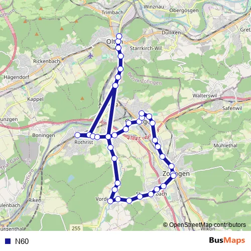 The first stop of the N60 bus route is Olten, Bahnhof and the last stop is Zofingen, Bahnhof. N60 is operational during am Wochenende.