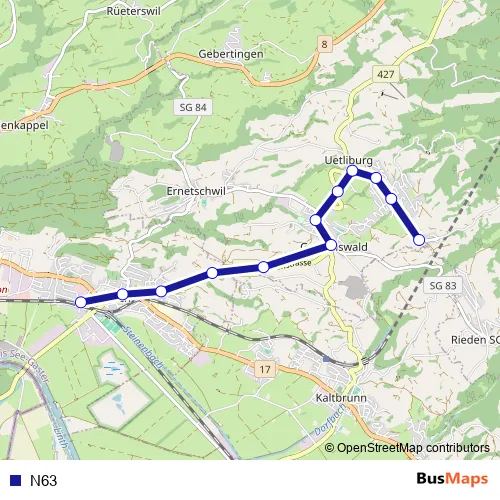 The first stop of the N63 bus route is Uetliburg SG, Giegen and the last stop is Uznach, Bahnhof. N63 is operational during täglich.
