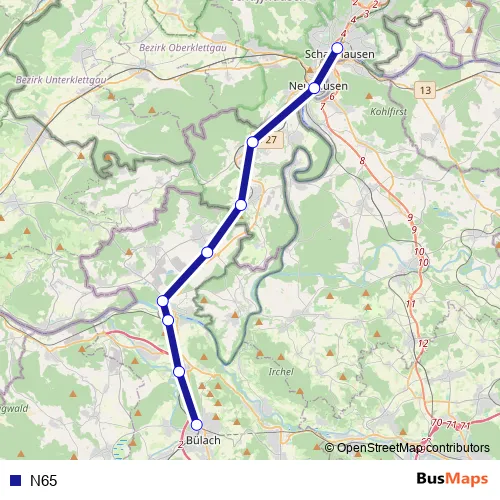 The first stop of the N65 rail route is Schaffhausen and the last stop is Bülach. N65 is operational during am Wochenende.