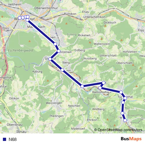 The first stop of the N68 bus route is Winterthur, Hauptbahnhof and the last stop is Wila, Bahnhof. N68 is operational during am Wochenende.