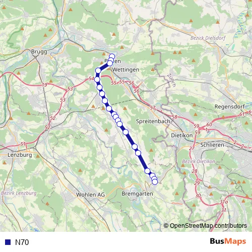 The first stop of the N70 bus route is Baden, Postautostation and the last stop is Berikon-Widen, Bahnhof. N70 is operational during am Wochenende.