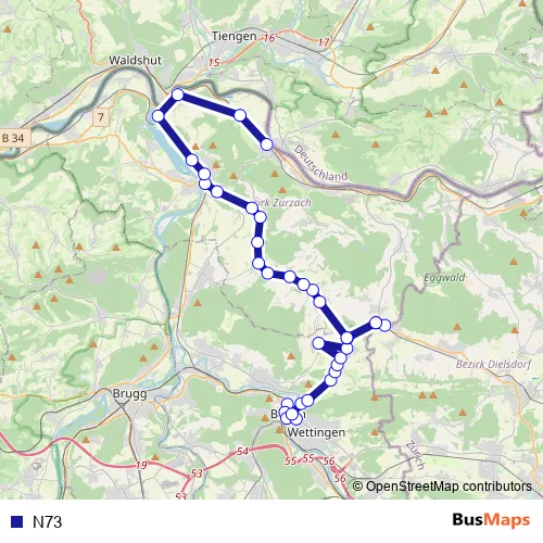 The first stop of the N73 bus route is Baden, Postautostation and the last stop is Bad Zurzach, Bahnhof. N73 is operational during am Wochenende.