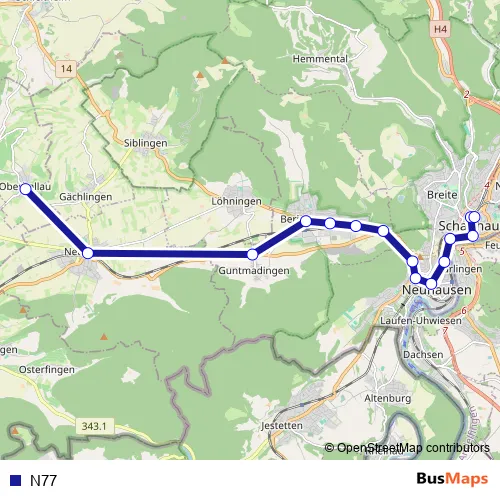 The first stop of the N77 bus route is Oberhallau, Trottengasse and the last stop is Schaffhausen, Bahnhof. N77 is operational during täglich.